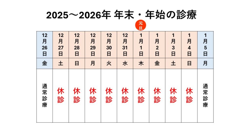 トップページーお知らせー年末年始の診療について 2025.12.20 年末年始の診療について 年末年始の診療について 12/27(土)~1/4(日) は休診となります。 どうぞよろしくお願いいたします。 一覧へ戻る 診療内容 受診に際して アクセス